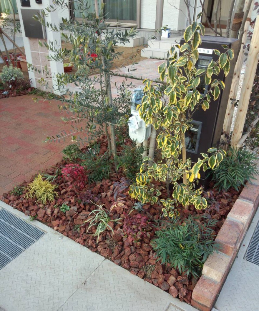 サブツリーにはジューンベリーやオリーブなど低木はマホニアコンフーサやアベリヤやヤマブキ・アジサイなどをセンス良く配置して