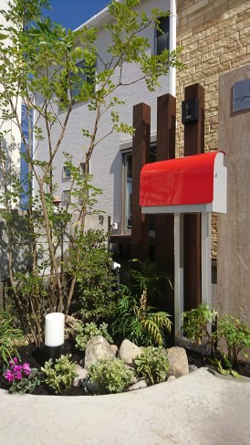 植栽のグリーンと赤色ポストに