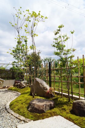 自然樹形の美しい雑木と鮮やかなグリーンの砂苔で
