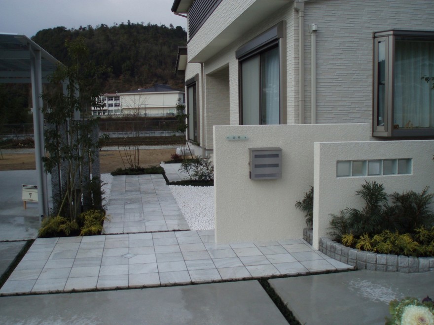 アプローチには天然石の平板スーパーホワイトを使用して、天然石だからこそ味わえる高級感があります。