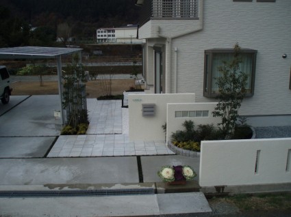 全体の眺め3枚の高さの異なる白壁にステンポスト・カクテルブロック・スリットとそれぞれにアクセントを付け奥行き感あふれる構成です。