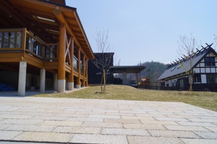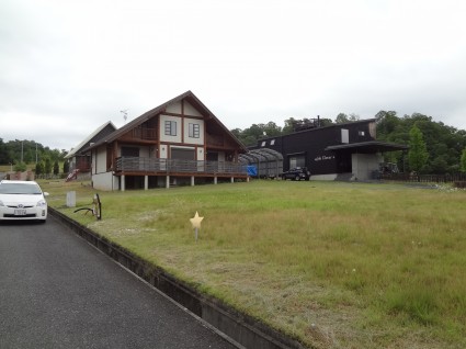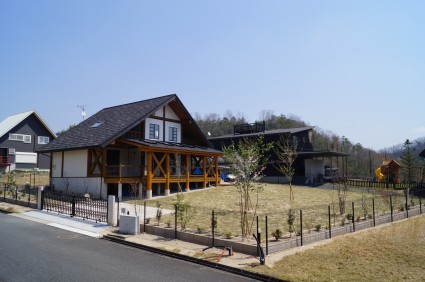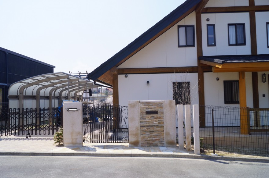 ログハウスの建物に御影石の門柱が堂々と門構えの存在感を出してくれています。
