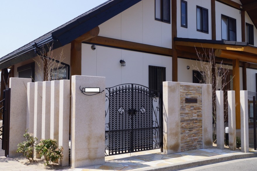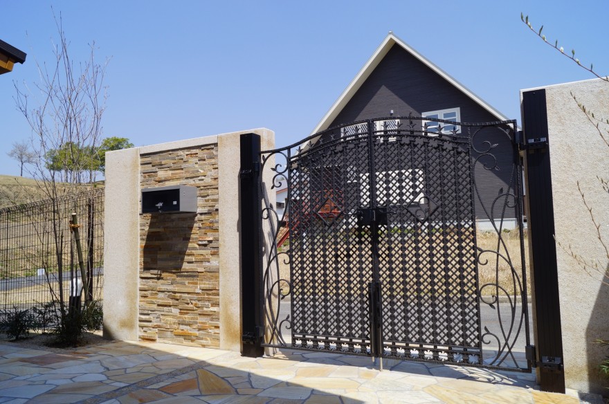 別注で創った石の門柱をくみあわせた門周りに重厚な鋳物門扉を組み合わせ、アクセントにボーダーストーンを貼り合せた石の高級感ある上質な門周りが仕上がりました。