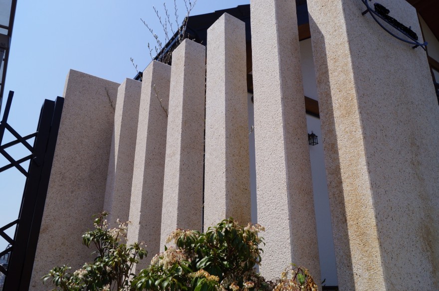 サイズを変えてデザインした門柱に同じ素材の石柱でスリット状に組み合わせています。