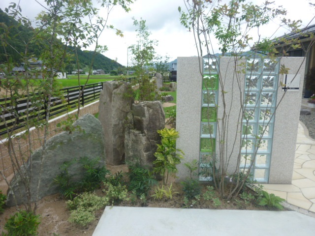 ミカゲ石とガラスブロック雑木でまとめた庭いつまでも飽きの来ない庭をイメージしてデザインしています。