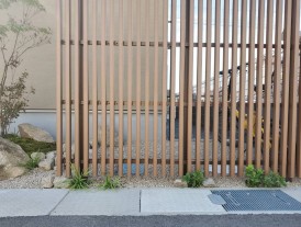 ウッド調の目隠しフェンスに色鮮やかな植栽が映える