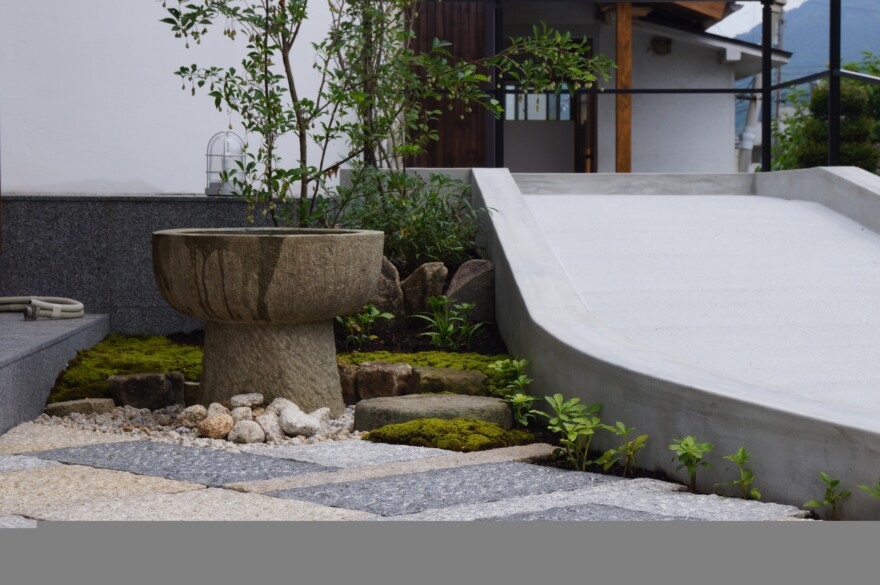 玄関前のスロープとの間にできた少しのスペースに以前からあった石臼をアクセントにしモダンな石畳に苔や自然石などを加えたきれいな和モダンの空間、小粋な玄関前にできた坪庭、色鮮やかな苔や石臼にはられた水が癒される趣のあるお庭になりました。