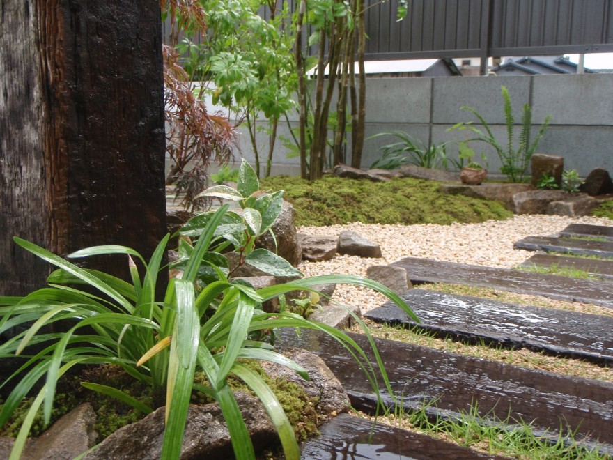 枕木と芝生のグリーンが和の空間にモダンさをプラスして風情あるわの趣です。