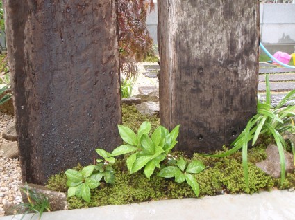 手前に植えたヤブランが枕木の足元をごくごく自然に優しく迎え入れるように演出してくれています。
