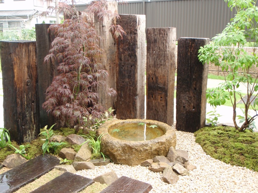以前からある水鉢と枕木を利用して和モダンな庭に仕上がりました。