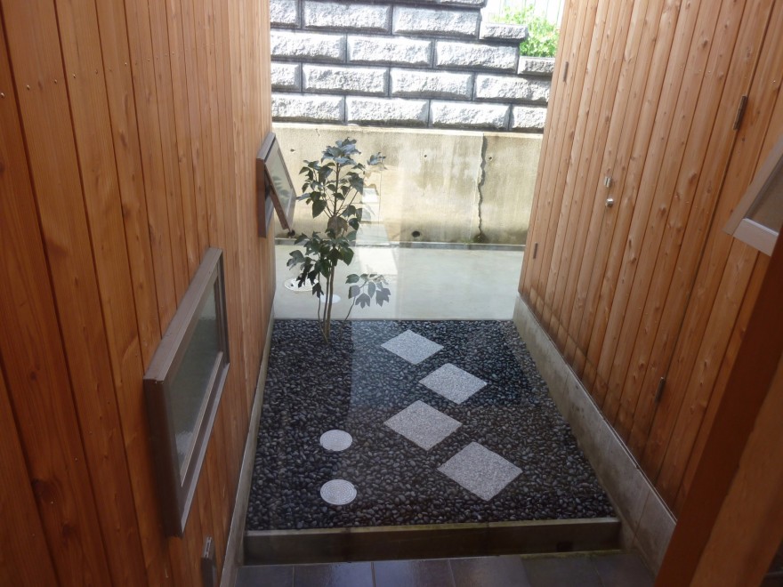 日陰でも良く育つカクレミノを坪庭に植栽し300角の板石と那智黒石のみでシンプルにデザインして仕上げています。