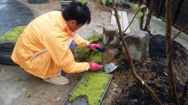 築山に苔を植えていきます。