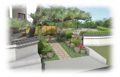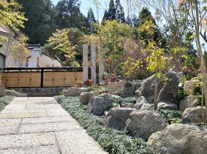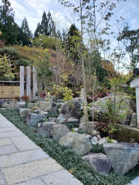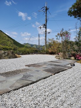石畳のスロープも土留め植栽とも調和も取れ